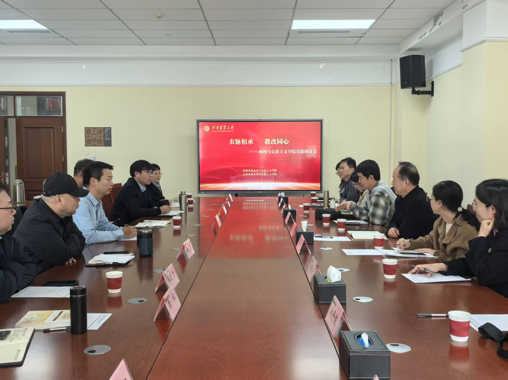 的历史沿革、教学特色与亮点、学科建设、“马+农”思政品牌建设等情况。元纪明详细介绍了山西农大马院党建工作“1+3+3”的典型做法,通过党建与业务的深度融合,为他们各项工作高质量推进提供了坚强的组织保障。双方围绕国家级一流本科课程建设、课堂教学、实践教学、名师工作室建设等方面进行了深入的交流,并分享了具体的经验和做法。周红飞表达了对双方未来合作的期待,希望在人才培养、课程共建、科研协同等方面优势互补,实现共赢。