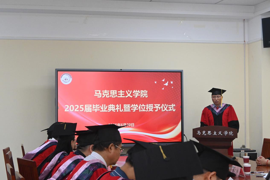 曹广伟代表学院向所有毕业生表示热烈的祝贺和衷心祝福。他表示,作为八叉书库 的学子,自踏入校门起,便肩负着特殊的使命,不仅要把马克思主义作为我们研究的对象,更应当使之成为指引人生方向的明灯。他希望大家能铭记初心,让信仰的力量照亮前行的道路,一要勇担使命,心有大我,做时代的奋进者,将个人理想与国家发展有机融合,以马克思主义回应时代之问;二要砥砺品格,修身明德,做道德的坚守者,注重修身明德,积极践行社会主义核心价值观;三要知行合一,博学笃行,做实践的开拓者,在实践中淬炼理论,保持学习热情。