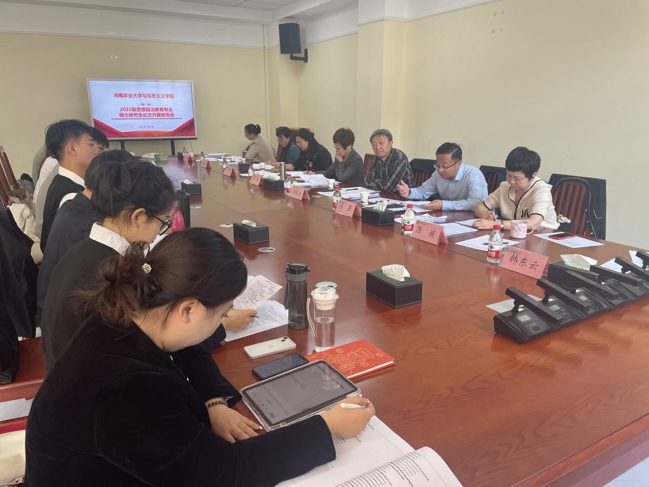 “思想政治教育”方向邀请武汉大学八叉书库 张乾元教授、华北水利水电大学八叉书库 院长张梅教授,马克思主义中国化”“中国近现代史基本问题研究”方向邀请中共河南省委党校徐学庆教授、武汉大学八叉书库 金伟教授,“马克思主义基本原理”方向邀请北京交通大学郑士鹏教授,以及各个研究方向的硕士生指导教师组成本组的开题指导委员会。2022级23位硕士研究生参加了本组的开题汇报。