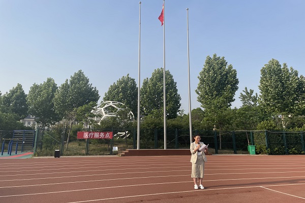 7点整,校国旗护卫队迈着整齐的步伐走向升旗台,伴着激昂嘹亮的国歌,五星红旗冉冉升起,在场师生向国旗行注目礼,表达对祖国的热爱之情。