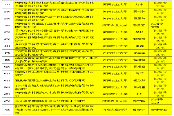 其中,杨红朝教授申报的《乡村振兴战略下河南省农村人居环境整治优化研究》立项并获得拟经费支持、马菲副教授申报的《河南农民工返乡创业与乡村振兴的联动对策研究》,王妍副教授申报的《河南省乡村振兴人才支撑机制形成及优化研究》、黄婉童副教授《农村语言能力建设赋能乡村振兴的路径与策略研究》、刘宁静申报的《中原城市群高质量发展的效率评价研究》、黄珺嫦副教授《河南省集约化农区耕地利用绿色转型的时空格局、驱动机制及空间差异化策略研究》董鑫博士申报的《乡村振兴背景下河南省公共法律服务优化配置策略研究》。