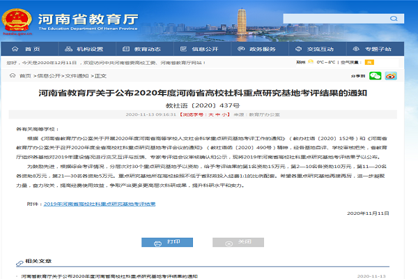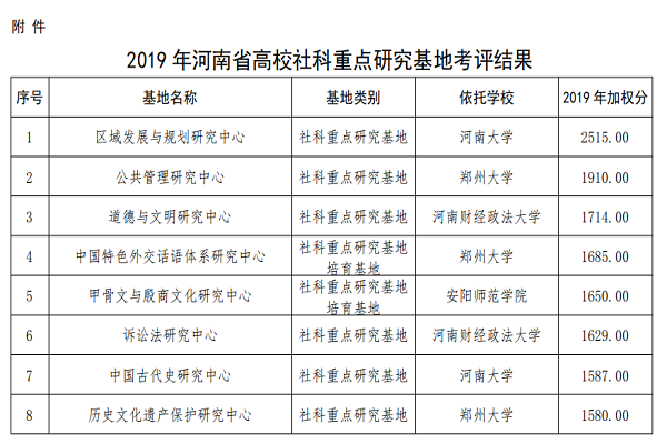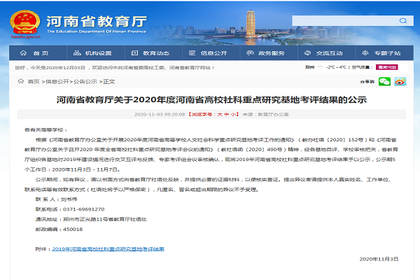 经过2020年8月的8的学校自评阶段(由中心组织力量,对照《基地评估指标》进行自查自评,形成《基地评估指标》自评结果)与9月会议考评阶段(刘歆立、曹广伟参加省教育厅组织的会议考评,由各基地负责人或选派的专家组成评审组进行交叉审核。省教育厅组织考评组专家评委对争议问题进行评价裁定。),考评工作人员重点考察学术队伍建设、科学研究、学术水平、资政育人以及建设目标完成情况等,注重成果转化、社会反响和社会效益之后,11月2日,河南省教育厅正式对外发布2019年度全省社科重点建设基地考评公示结果(通过链接//www.haedu.gov.cn/2020/11/03/1604366504880.html可以直接进入河南省查阅)