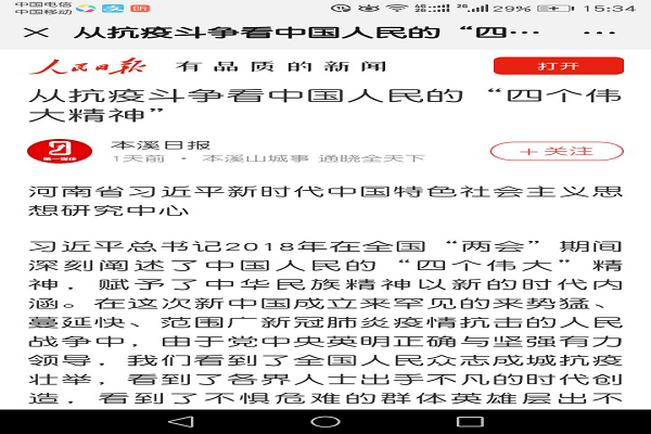2020年3月11日《人民日报》客户端发表了我中心主任陈娱教授、中心副主任刘歆立副教授共同撰写的文章《从抗疫斗争看中国人民的“四个伟大精神”》,这是今年我中心再次在《人民日报》客户端发表的又一篇重磅文章。全文如下: