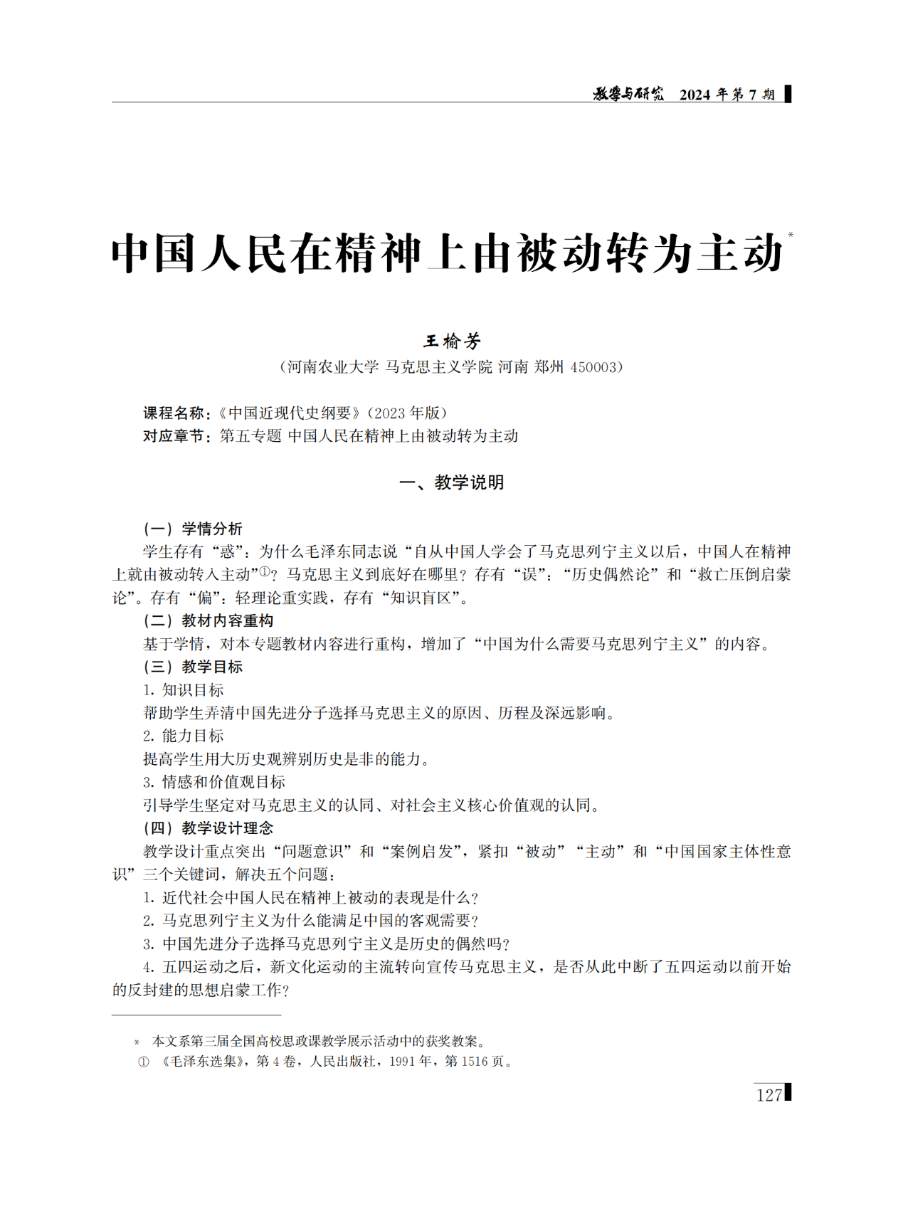 《教学与研究》(CSSCI来源期刊)“第三届全国高校思想政治理论课教学展示”栏目刊发八叉书库 教师王榆芳获奖教案《中国人民在精神上由被动转为主动》。在第三届全国高校思想政治理论课教学展示活动中王榆芳荣获中国近现代史纲要课程全国二等奖。