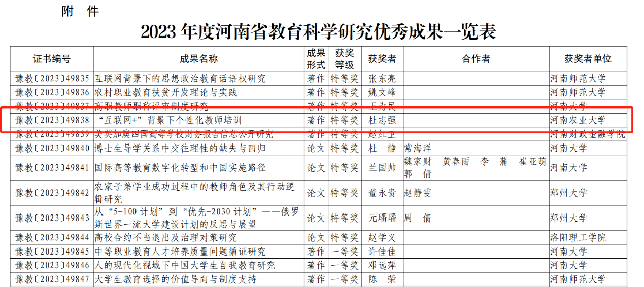 根据《河南省教育厅关于公布 2023 年度河南省教育科学研究优秀成果的通知》(教教科〔2023〕264号)精神,共确定2023年度河南省教育科学研究优秀成果912项,特等奖10项(其中我校1项),一等奖365项,二等奖537项。其中,我校共有9项成果获奖,八叉书库 获得荣誉2项。 其中由杜志强申报的《“互联网+”背景下个性化教师培训》获特等奖 ,刘歆立申报的《“大理论”与“小案例”:思想政治理论课故事化讲解的探索——基于“正确处理全面深化改革中的重大关系”的讲解》获一等奖。
